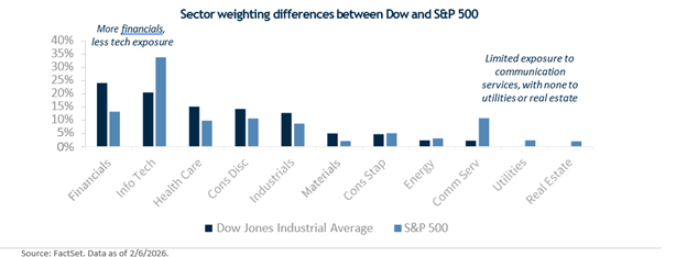 • The Dow is price-weighted, so companies with higher share prices exert more influence, regardless of size. As a result, a stock like Goldman Sachs can carry more weight than Nvidia simply because its share price is higher, even though Nvidia’s total market value may be much larger.
